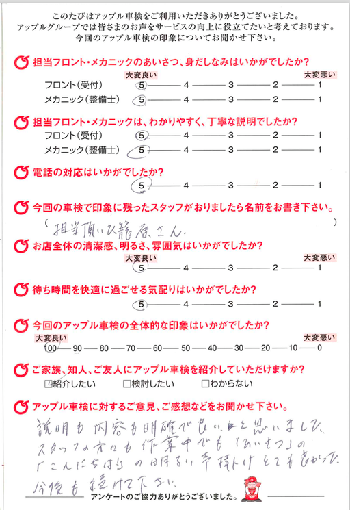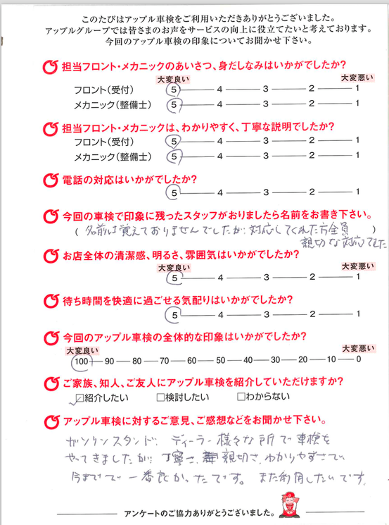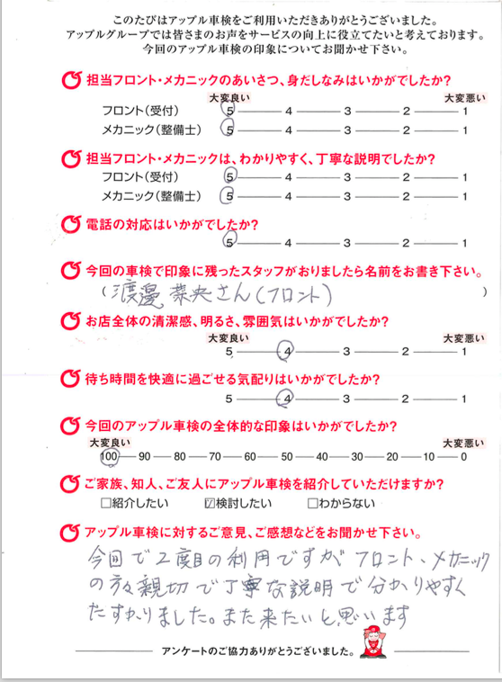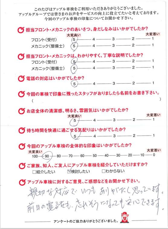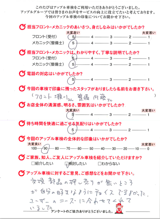 | お客様とのご相談になりますが、基本的に交換の必要のない部品は交換致しません。 点検後にどうしても検査に通らない部品等が出てきましたら交換となりますが、 国家整備士から説明させて頂いた上で、ご相談させて頂きます。 |